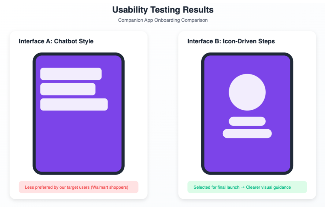 The insights gained led to streamlined onboarding and a more intuitive app experience, aligning the product with user expectations and Walmart’s retail requirements.